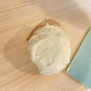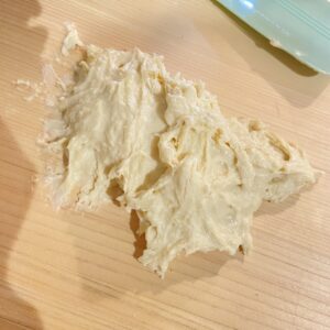 べたつく生地を一生懸命にこねてはカードで集めてこねてを繰り返し。ここまでまとまりました!やったね!!