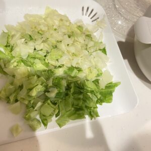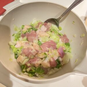その間に、前もってレンチンして粗熱をとっておいたキャベツを粗みじん切りして、そのあとにもも肉も粗みじん切り、あじつけしたものをボウルによけておきます。